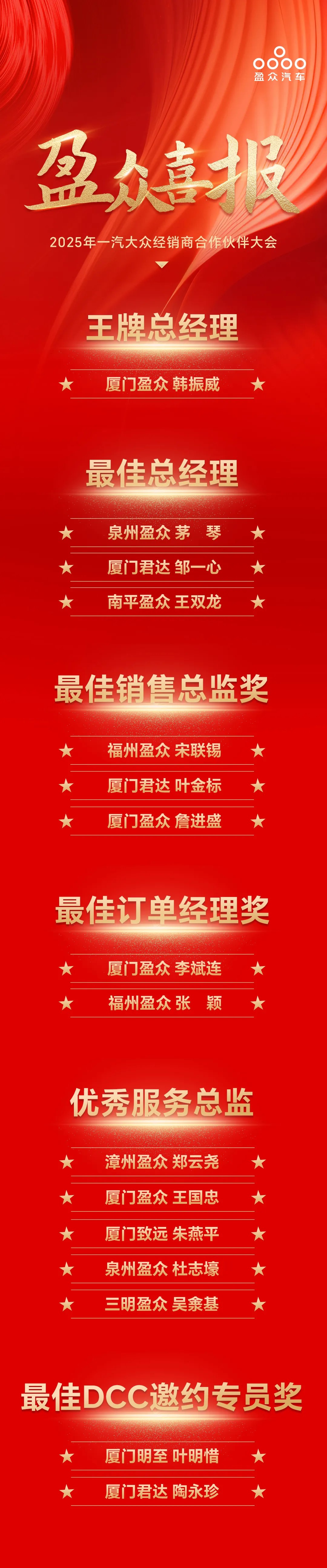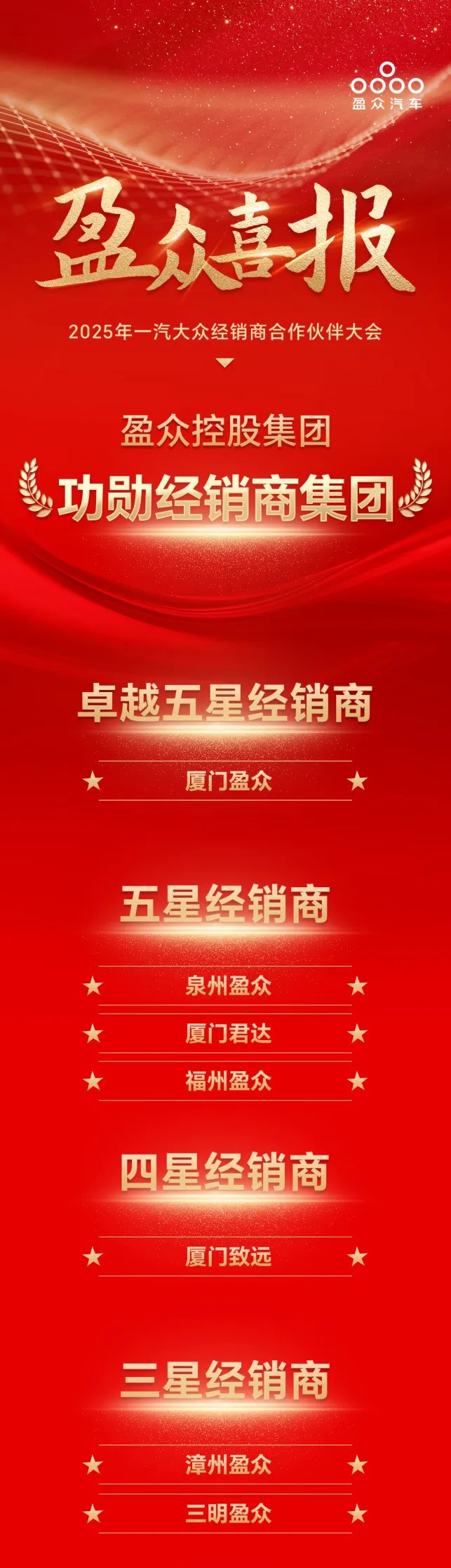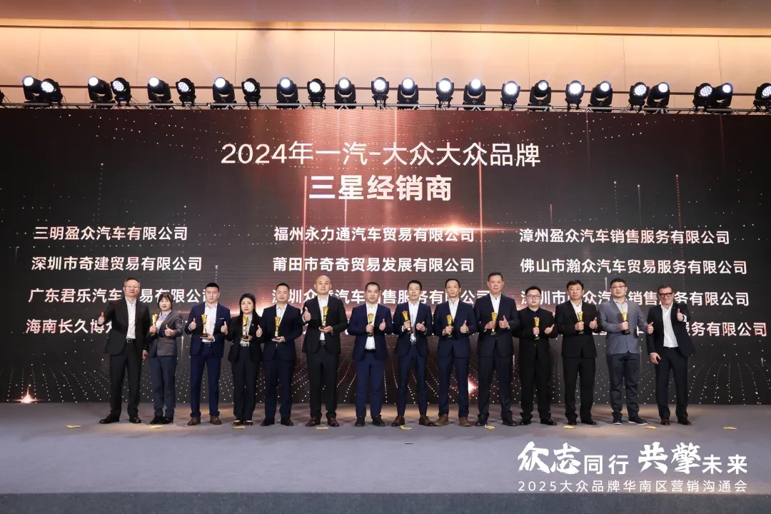近日,2025大眾品牌經銷商合作伙伴大會、一汽-大眾華南區(qū)經銷商年會相繼召開,2024年度一汽-大眾優(yōu)秀經銷商名單及個人獲獎名單新鮮出爐。盈眾一汽-大眾團隊憑借過硬的綜合實力及銷售業(yè)績、運營管理、客戶服務體驗等多維度的亮眼表現,榮獲“功勛經銷商集團”“卓越五星經銷商”“五星經銷商”“王牌總經理”等系列獎項。