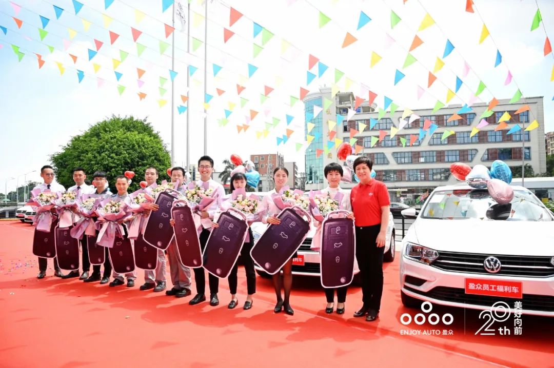 盈眾周年慶期間推出百余輛車的員工購車福利。盈眾控股集團黨委書記鄭藝紅現(xiàn)場為十位員工代表交付員工福利車。